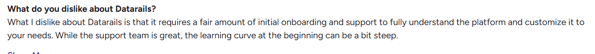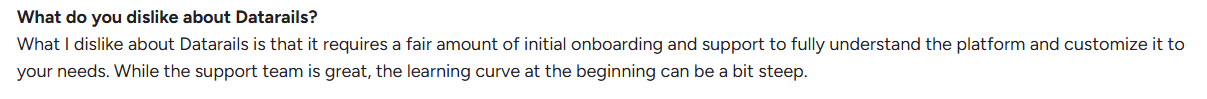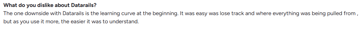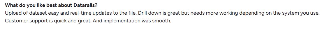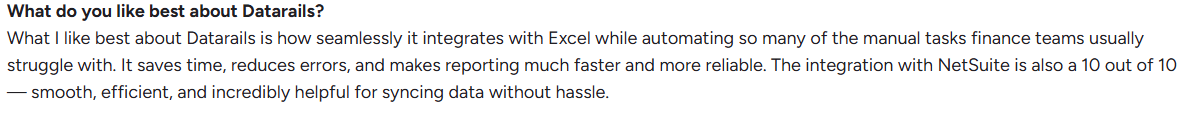 Reviewers on G2 acknowledge Datarails’ strengths in structured reporting and financial consolidation, but note that its onboarding and learning curve can limit efficiency in fast-changing financial environments.
