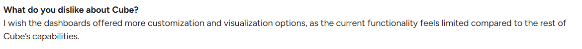 | Implementation time | Weeks; Reddit users complained about Cube Software having a high turnover rate within their team, leading to delays during implementation and frequent rework. | Weeks; may require an implementation partner | Weeks |