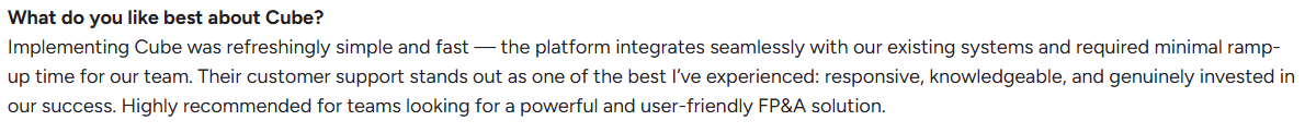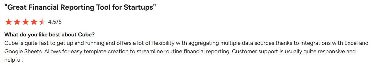 Cube’s biggest strength is its spreadsheet-native interface. Finance teams can continue using familiar Excel or Google Sheets layouts, which keeps onboarding simple. On G2, users frequently highlight Cube’s “minimal learning curve” and “intuitive setup,” often going live in a few weeks without external consultants.