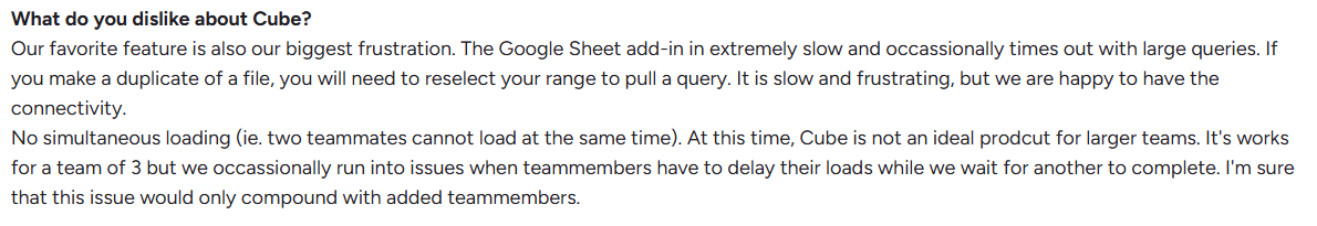 For small teams needing a low-friction transition from Excel, Cube offers comfort and speed, but long-term usability may require additional process controls or IT oversight.