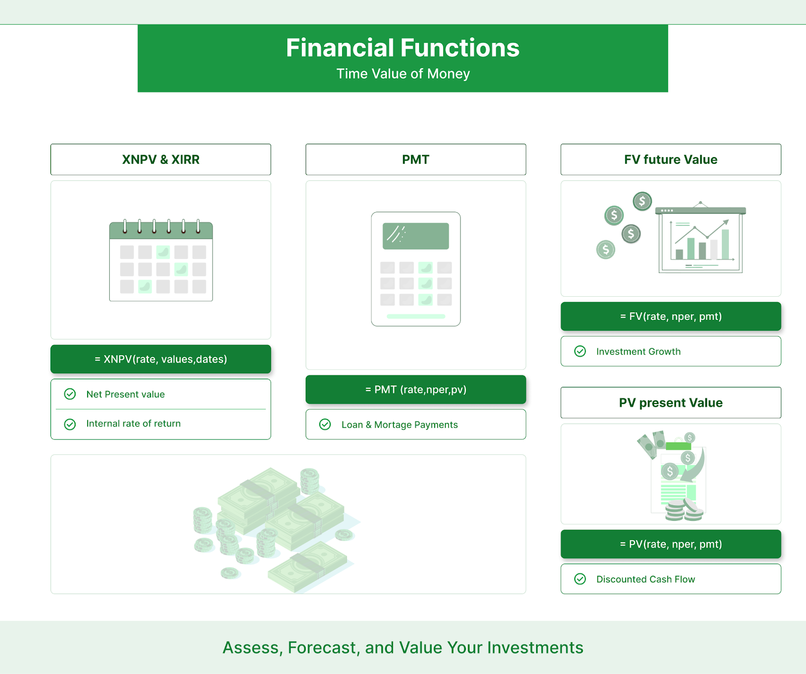 - For time‑value‑of‑money analysis (e.g., calculating the net present value of an investment), use XNPV or XIRR to account for actual cash flow dates instead of assuming equal periods.